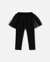 A tulle skirt overlay adds texture and whimsy to these oh-so-essential bottoms. A must-have for the girly girl who loves the comfortable feel of leggings, this adorable one-piece design features a stretch elastic waistband, a vertical ribbed texture, and a flared tulle skirt with an allover dot pattern.