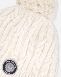 Lined with polar fleece for added warmth, this knit cap in off-white is winter weather-approved. In a Peruvian silhouette with extended side panels that cover and protect the ears, this winter hat features a chunky cable knit texture, braided side tassels, a fluffy pompom, and a logo patch for brand distinction.