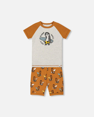 Our Organic Cotton Two-Piece Short Pajama Set Sloths on Tan and Mottled Background will keep him looking cute and feeling cool and comfortable throughout the night. This adorable pajama set features a short sleeve top with a crew neckline and a playful graphic print on the chest. An allover print short with an elastic waistband makes it super comfy!