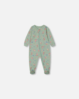 Printed Organic Cotton One-Piece Pajama Small Pink And Blue Flowers On Light Sage