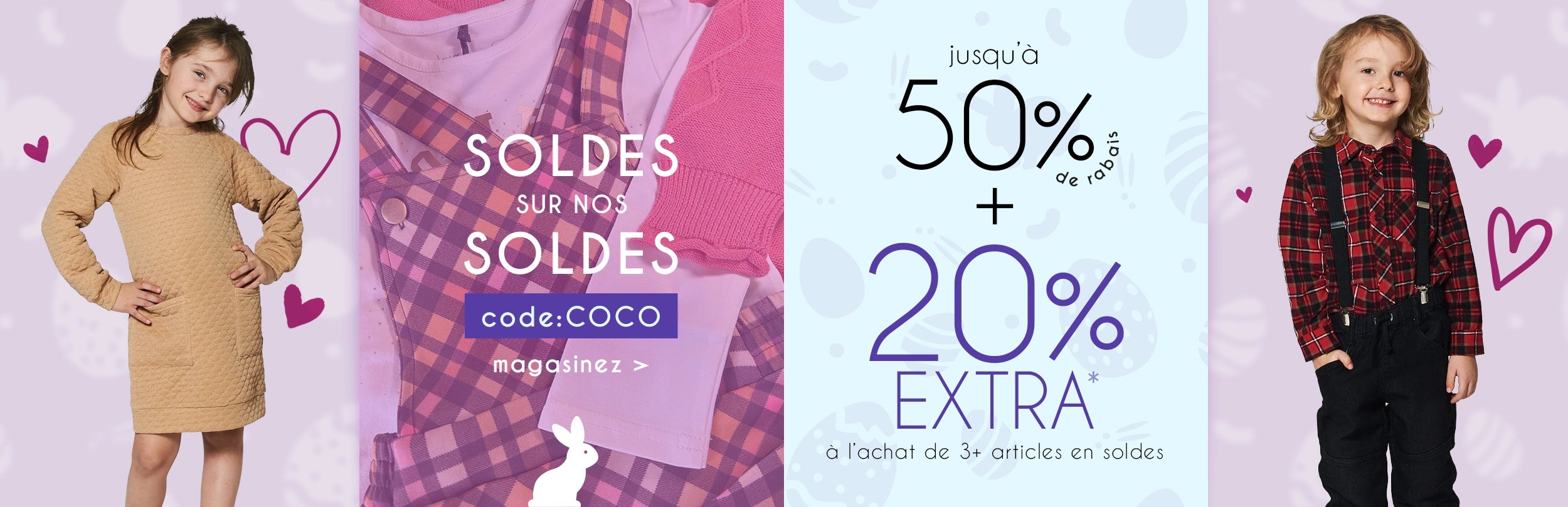 De plus, nous proposons des promotions sur les habits pour enfants tout au long de l'année ! Consulte donc notre section Liquidation pour retrouver les vêtements pour bébés et enfants en solde ! C'est ta chance d'acheter les vêtements des collections précédentes à pas cher.