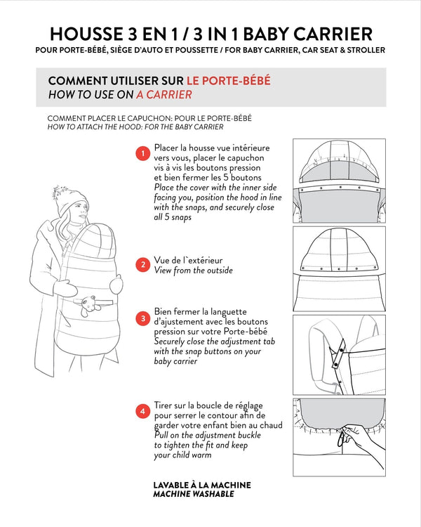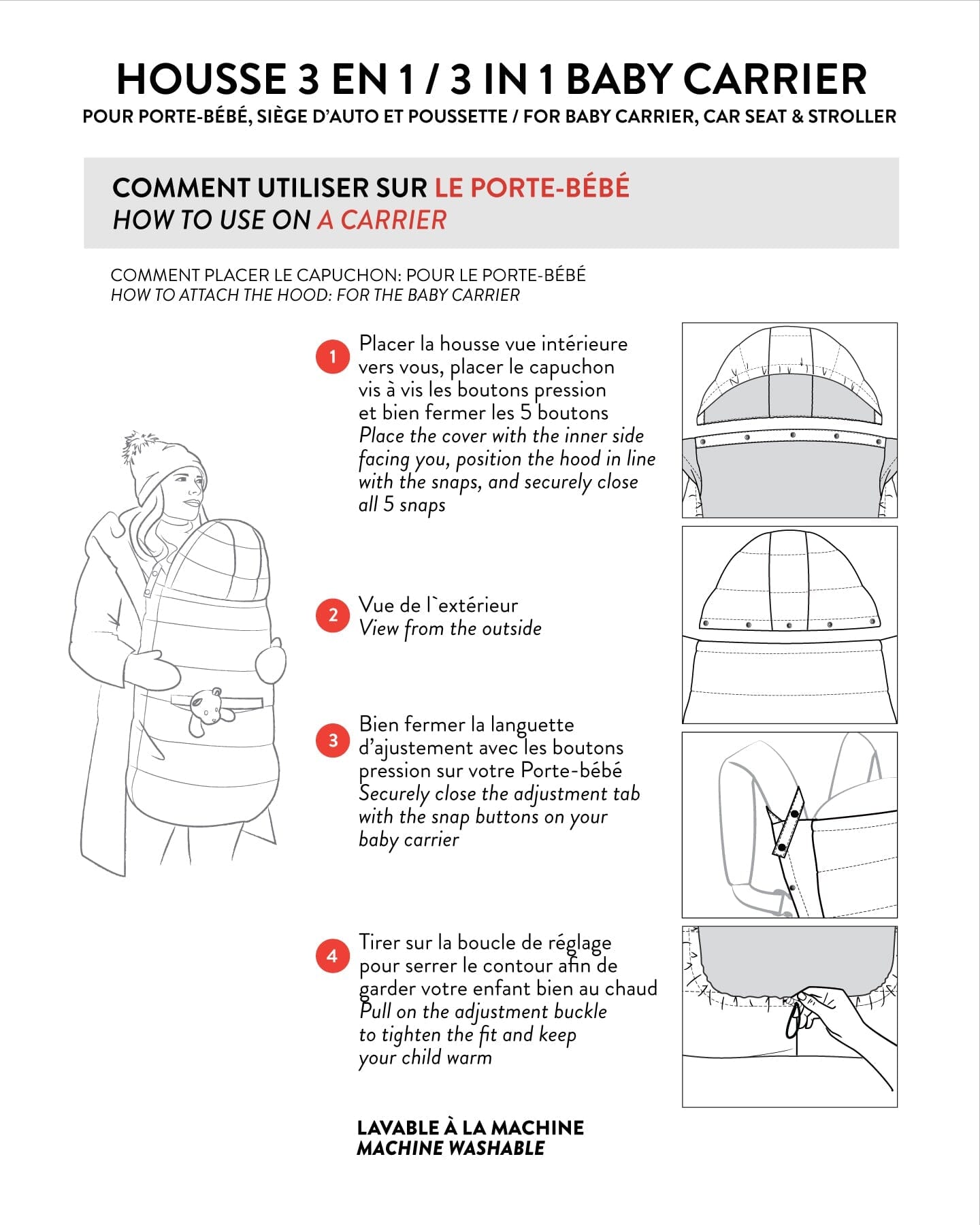 Attaches avec boutons pressions en haut pour fixer au porte-bébé ou poussette / siège d’auto