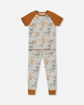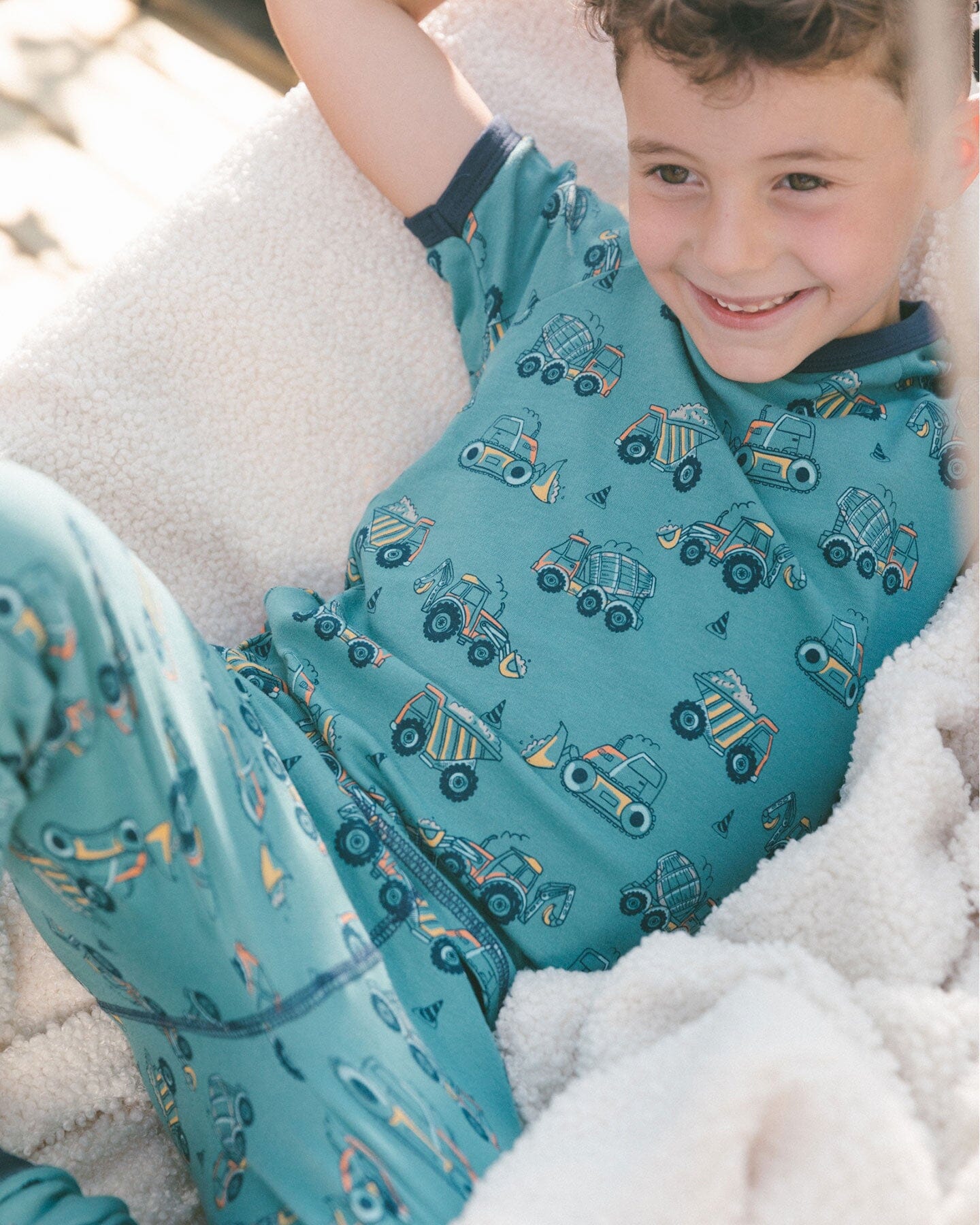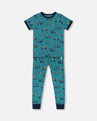 Ensemble pyjama deux pièces avec haut à manches courtes et pantalon imprimés sarcelle avec camions jaunes en coton biologique