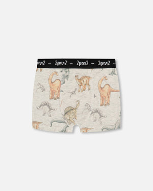 Boxer imprimé avec dinosaures sur fond tacheté et beige en coton biologique