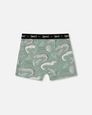 Boxer imprimé avec crocodiles gris sur fond sauge claire en coton biologique
