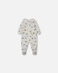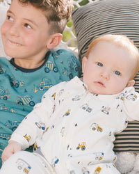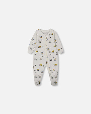 Pyjama une pièce imprimé de camions multicolores sur fond blanc cassé en coton biologique