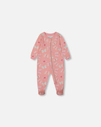 Pyjama une pièce imprimé avec papillons roses et bleus sur fond vieux rose en coton biologique