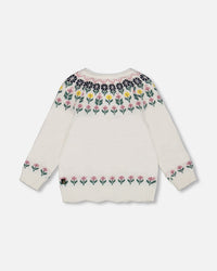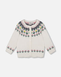 Jacquard Knit Cardigan Off-White With Floral Pattern