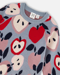 Knit Sweater Blue And Red With Apple Heart Jacquard
