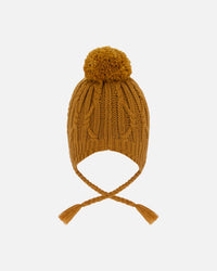 Lined with polar fleece for added warmth, this knit cap in brown sugar is winter weather-approved. In a Peruvian silhouette with extended side panels that cover and protect the ears, this winter hat features a chunky cable knit texture, braided side tassels, a fluffy pompom, and a logo patch for brand distinction.