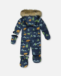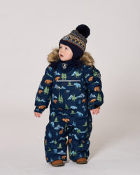 One-Piece Baby Play Snowsuit Designed For Car Seat Navy Animal Print