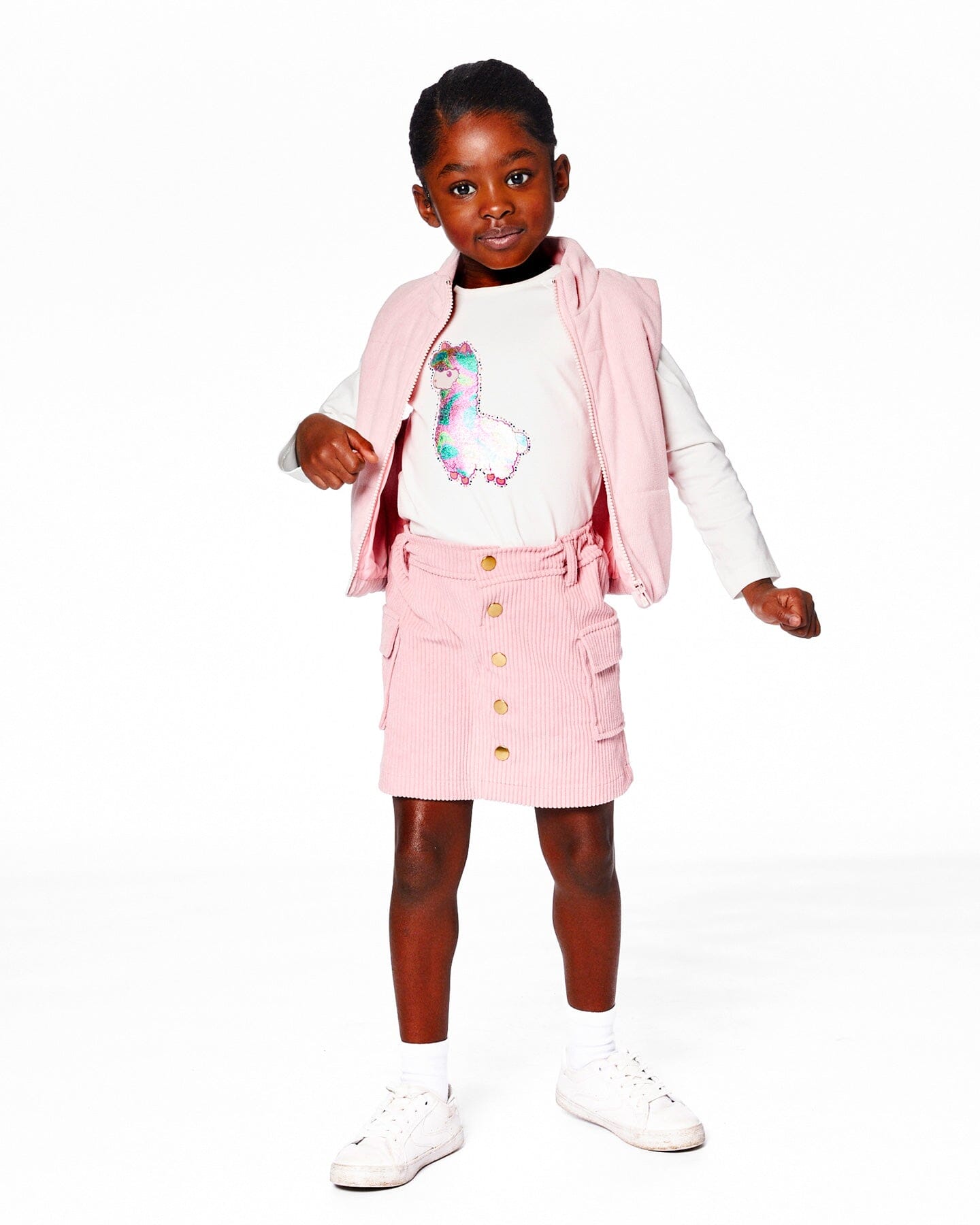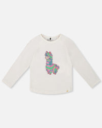 Our Organic Cotton T-Shirt Off White With Llama is soft, comfy, and full of llama magic. This long sleeve top features raglan sleeves, a round neckline, a curved bottom hem, and a shiny metallic llama print for added charm. It’s a playful and easy t-shirt for school days or weekend adventures.