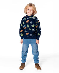With an allover bear, tree, and mountain print, this fleece top is made for the boy who loves camping, fishing, and spending time in the woods. In ultra-soft cotton/poly fleece, this sweatshirt features a pullover silhouette with long sleeves, a crew neckline, and stretchy rib knit trim at the neck, cuffs, and hem.