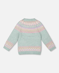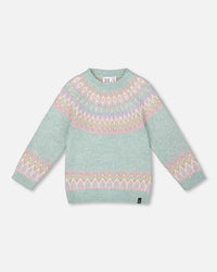 Our Sweater With Norwegian Jacquard Turquoise Blue is a cheerful layering piece for chilly days. This knit pullover features a playful fair isle jacquard in soft pastel shades across the upper chest, bottom hem, and cuffs, with ribbed trims for extra comfort and shape. Made from a warm and cozy knit blend, this sweater brings both style and snugness to winter wardrobes.